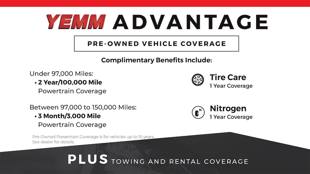 Yemm provides more value than other dealerships with the Yemm Advantage Program! -New Vehicles receive 1 Year / 15,000 mile Dent & Ding Coverage, Tire & Wheel Coverage and Key Protection Coverage for FREE! -Pre-owned Vehicles under 97,000 miles receive a 2 Year / 100,000 mile Powertrain Warranty for FREE! Pre-owned Vehicles with 97,000 to 150,000 miles receive a 3 month / 3,000 mile Powertrain Warranty for FREE! Some exclusions apply, Vehicles 10 Years and older do not qualify. Call us for details!